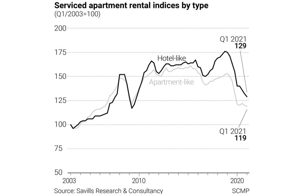 Rents fell by 1.4 per cent in the first quarter, bringing the losses to 24 per cent over the past two years, according to data compiled by Savills. Apartment-like rentals reached the lowest since the first quarter of 2007. Occupancy levels averaged 57 per cent vs from 62.5 per cent on average in 2020, according to industry data.