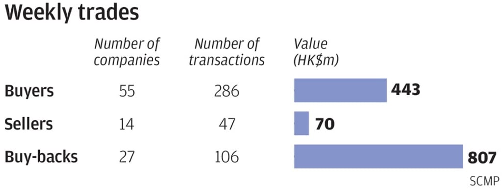 A total of 55 companies recorded 286 purchases worth HK$443 million (US$56.45 million) versus 14 firms with 47 disposals worth HK$70 million. The figures were up from the previous week’s 46 companies, 178 purchases and HK$290 million on the buying side and 8 firms, 29 disposals and HK$54 million on the selling side.