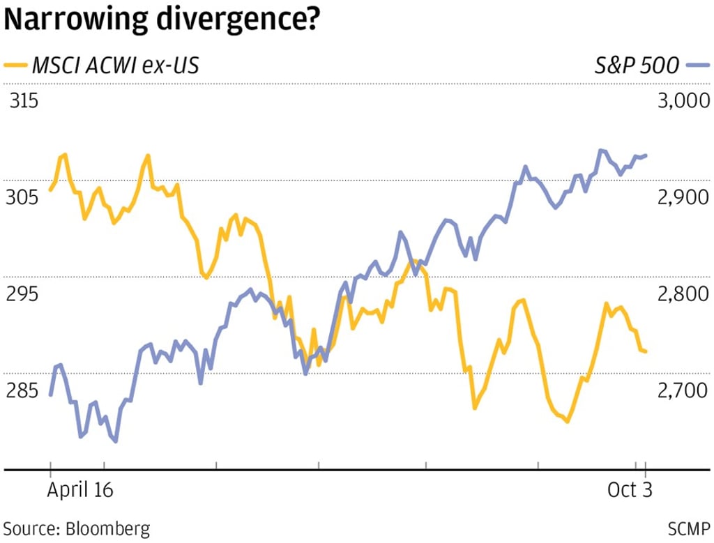 The divergence between US equities and those in the rest of the world has widened sharply this year. Since early May, the benchmark S&P 500 index has surged more than 11 per cent while the MSCI All Country World Index ex-US, a gauge of stocks in advanced and emerging economies which excludes American shares, is down nearly 3 per cent.