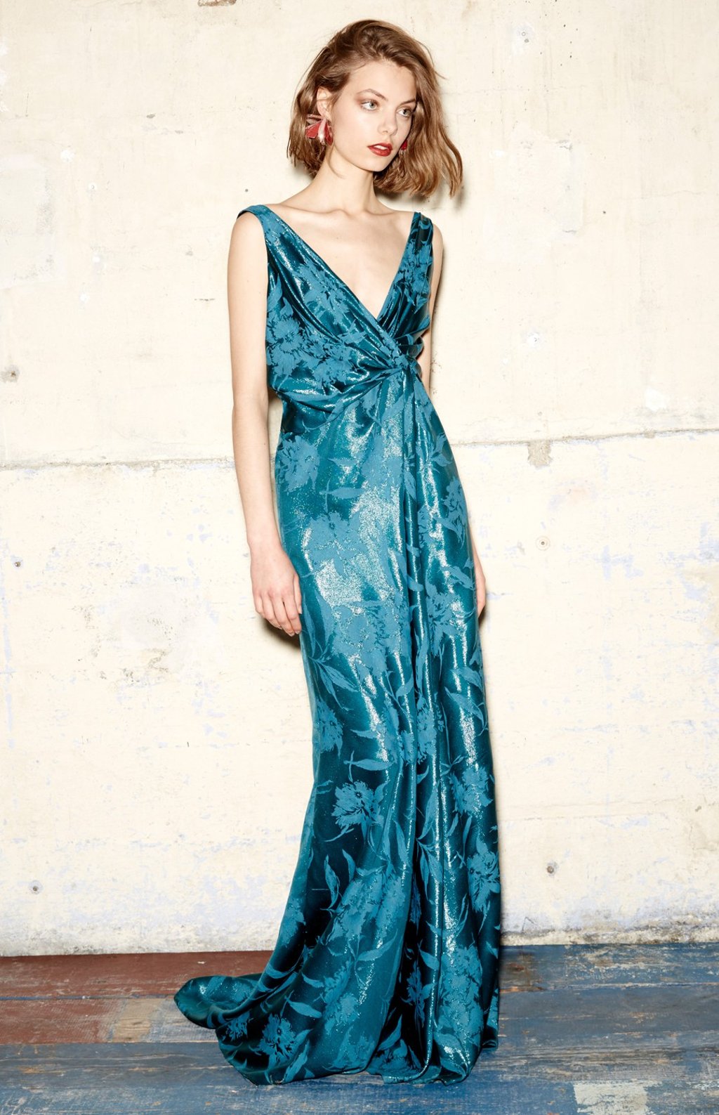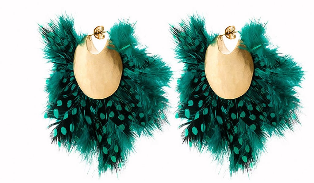 Check out the Paule Ka asymmetric gown in a gorgeous blue and the spectacular Katerina Makriyianni feather earrings in green