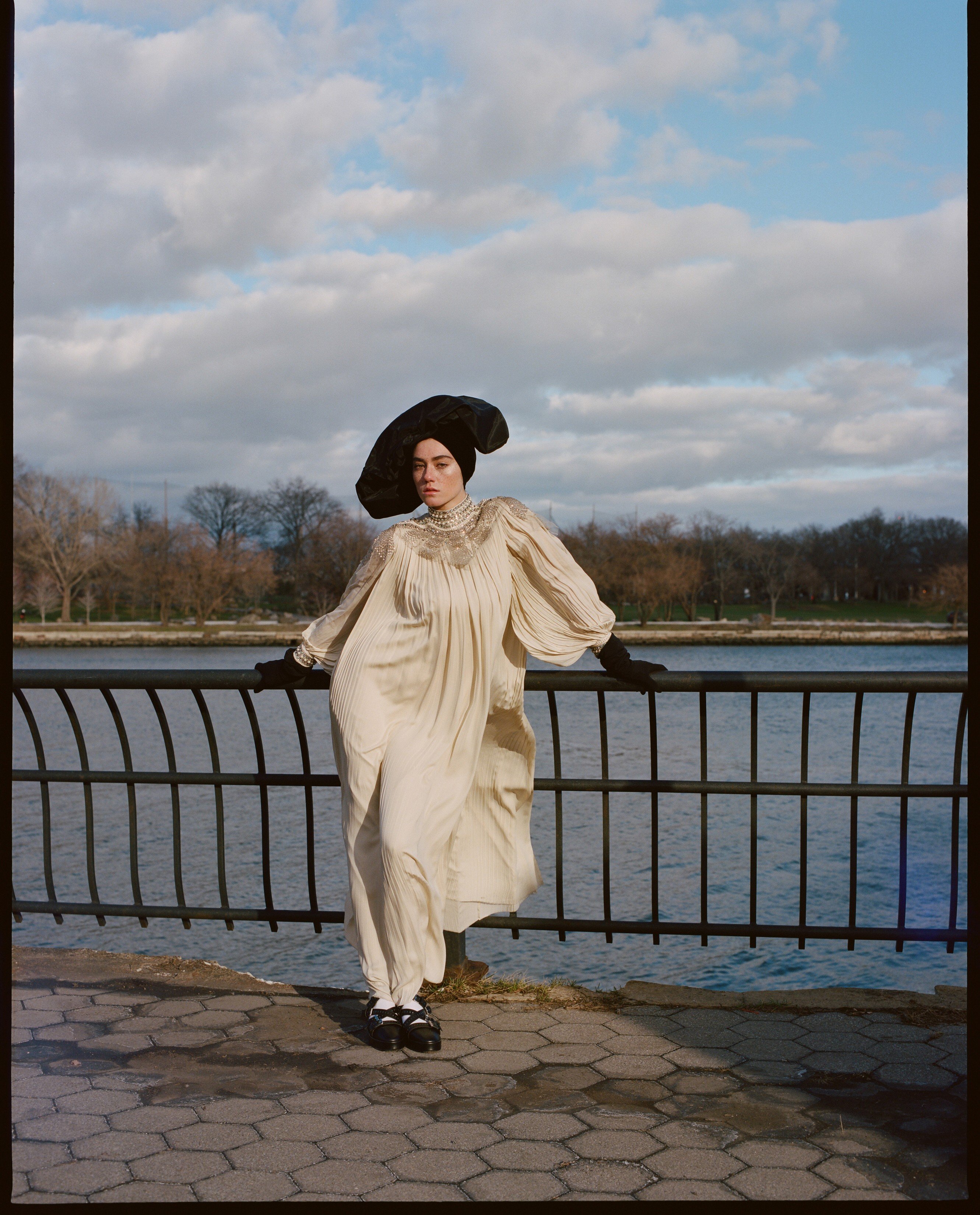 Embellished dress by Gucci (inquiries: 2524 4492). Opera gloves by Marc Jacobs (inquiries: 2523 3324). Hat by Ellen Christine Couture. Tights by Calzedonia (inquiries: 3468 5304). Sandals (HK$6,290) by Robert Clergerie.