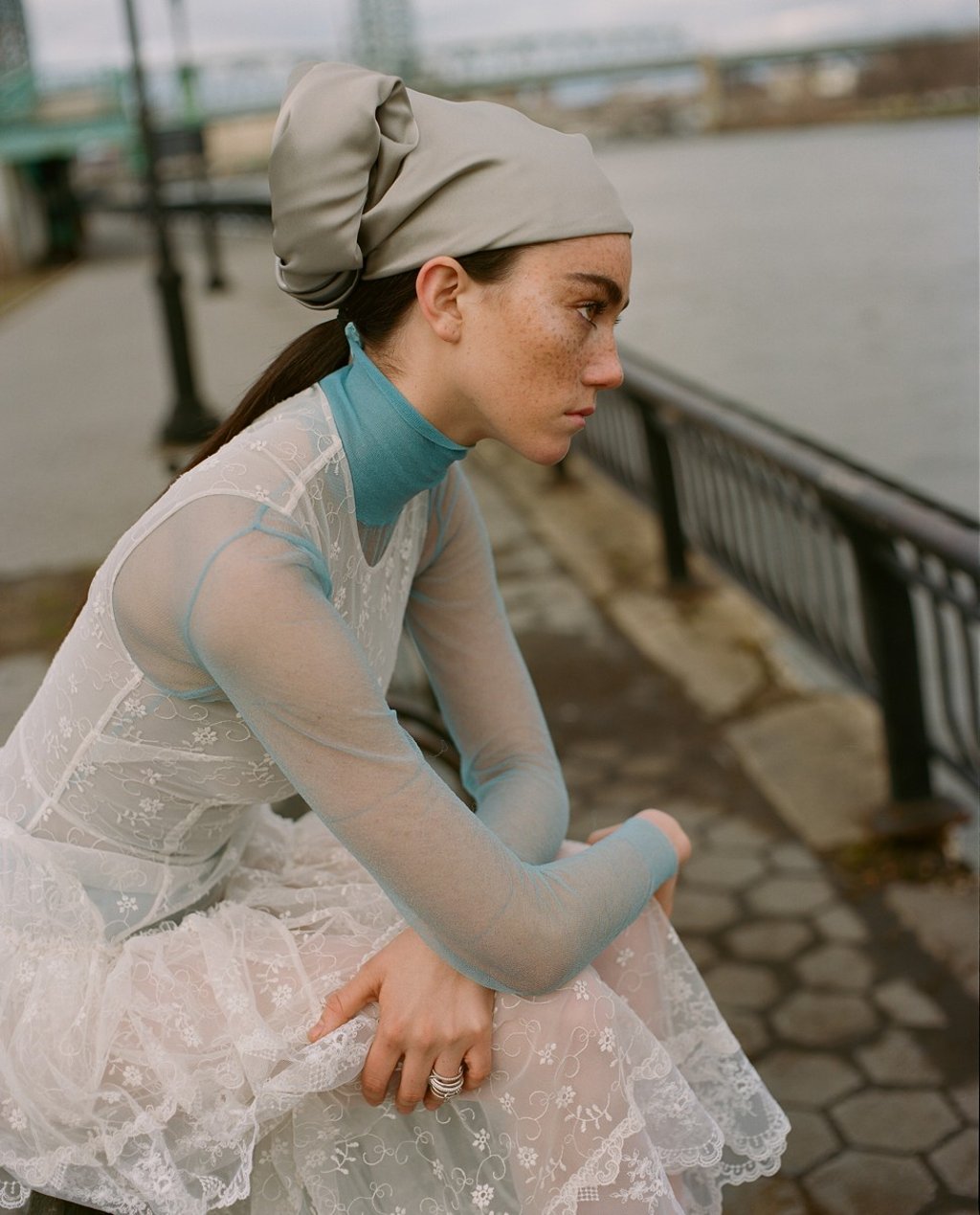 Sheer dress (HK$8,599) by Simone Rocha. Sheer bodysuit by Marc Jacobs. Silk turban by Stephen Jones for Marc Jacobs. Rings with diamonds by Spinelli Kilcollin.