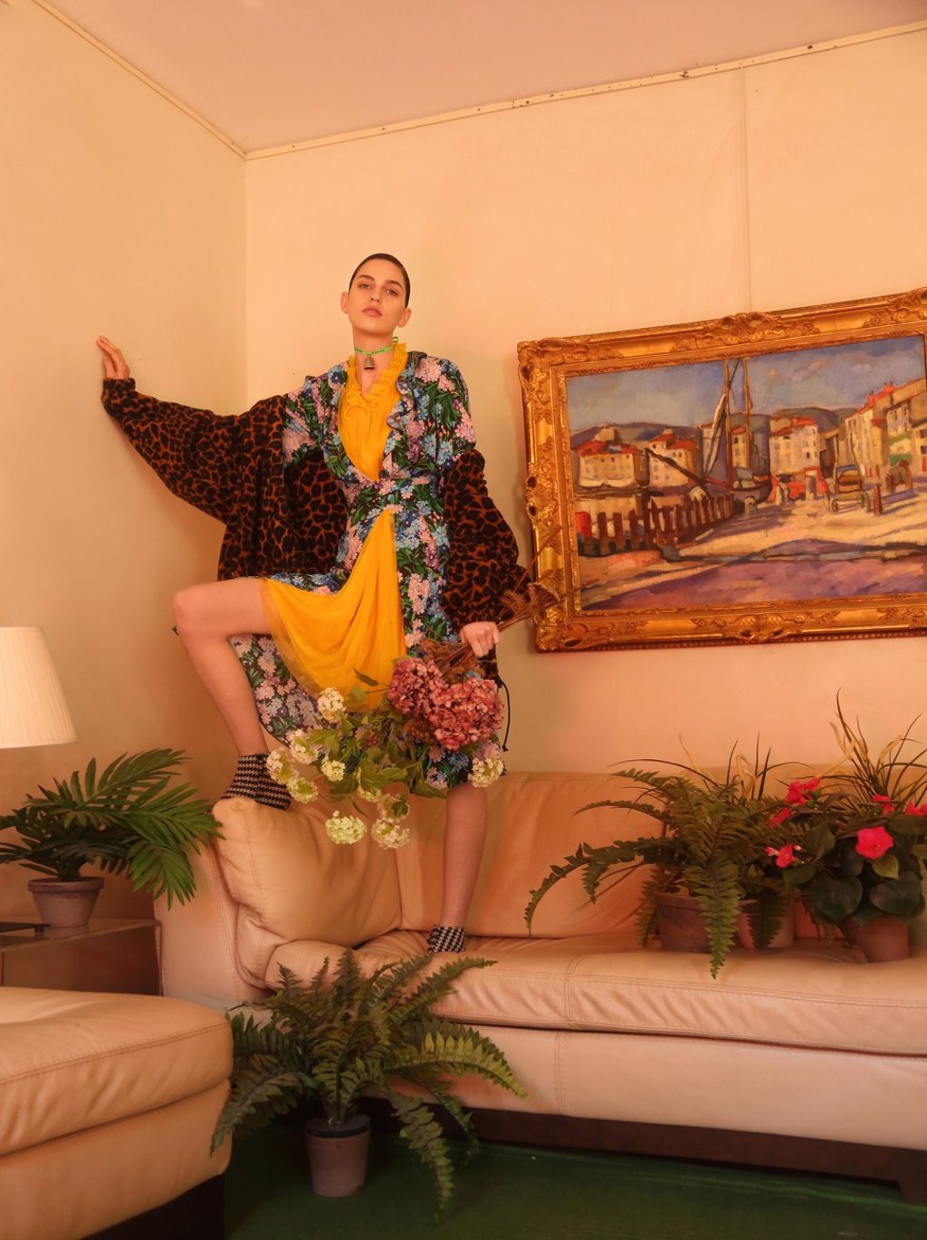 Dress (HK$26,900), animal-print jacket (HK$12,400), ankle boots (HK$13,700) and bell necklace (HK$5,400), all by Balenciaga.