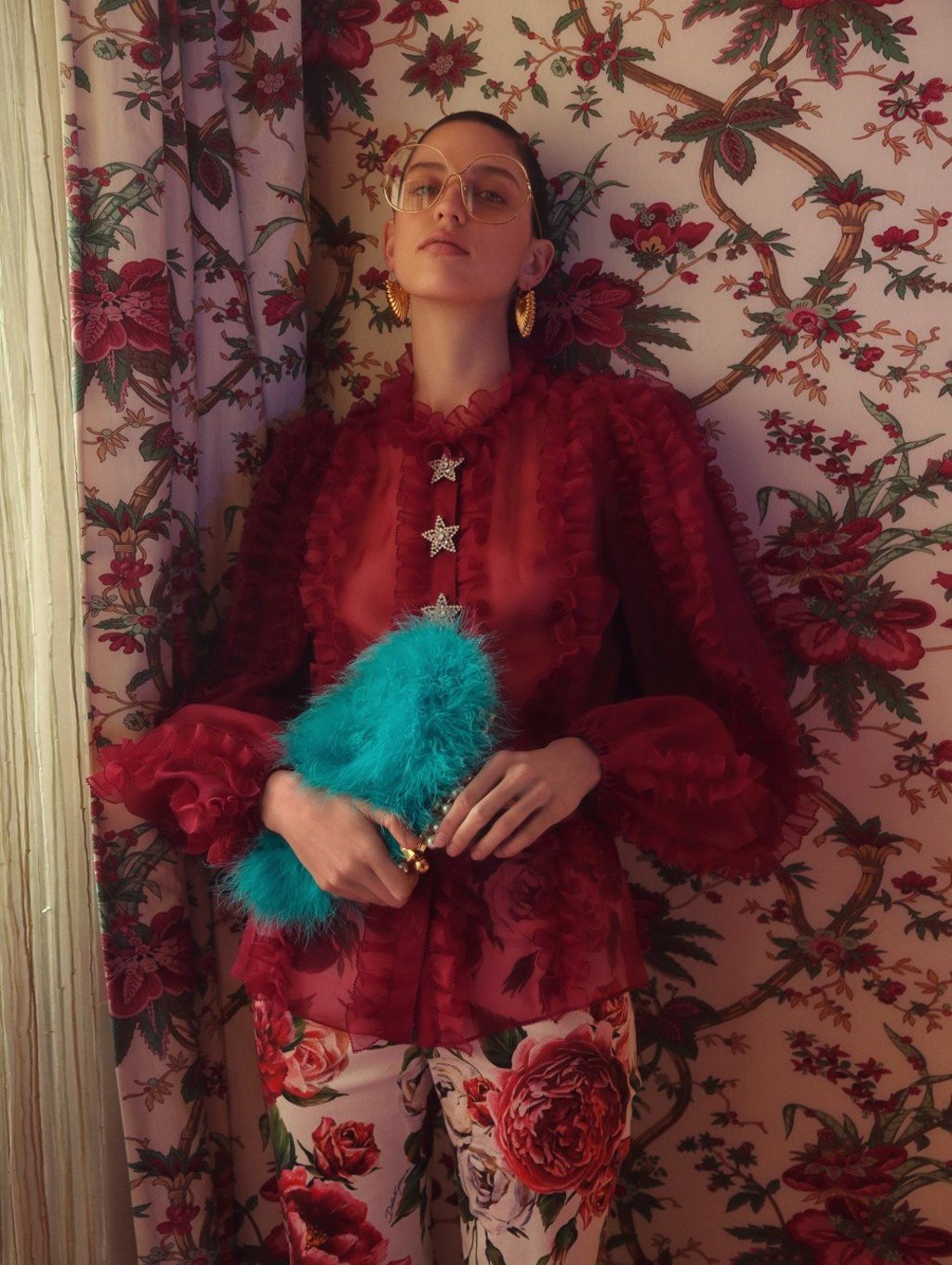 Sheer shirt with crystal star buttons and floral- print trousers, both by Dolce & Gabbana (inquiries: 2877 5558). Earrings (HK$5,600) by Céline. Feather purse (HK$12,600) by Mulberry. Glasses by Gucci (inquiries: 2524 4492).