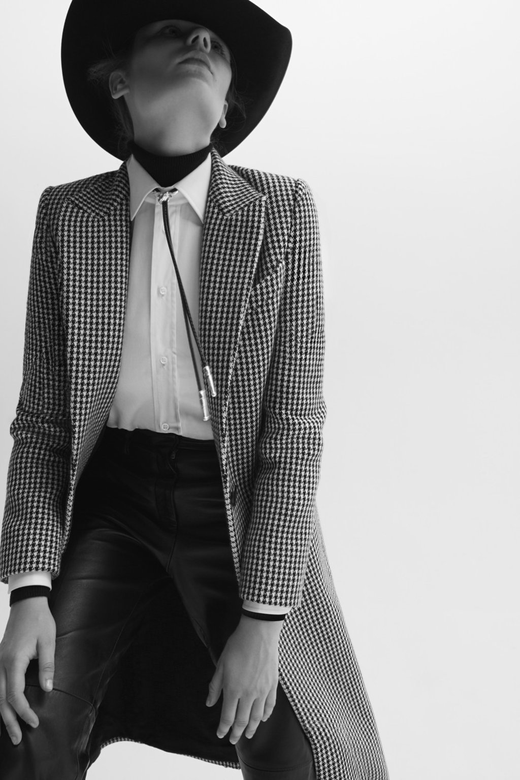 Houndstooth coat (HK$33,200) by Givenchy. Turtleneck jumper (HK$1,190) by Calvin Klein Jeans. Shirt (HK$3,700) by Giorgio Armani. Trousers (HK$11,537) by Golden Goose Deluxe Brand. Wool hat (US$175) and bolo tie (US$30) by Planet Cowboy.