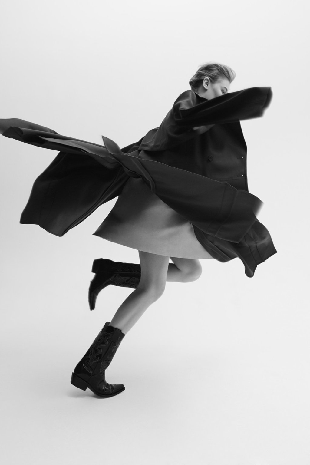 Trench coat (US$675) by A.P.C. Wool gaberdine coat (HK$29,310) by Chloé. Leather boots (US$295) by Planet Cowboy.