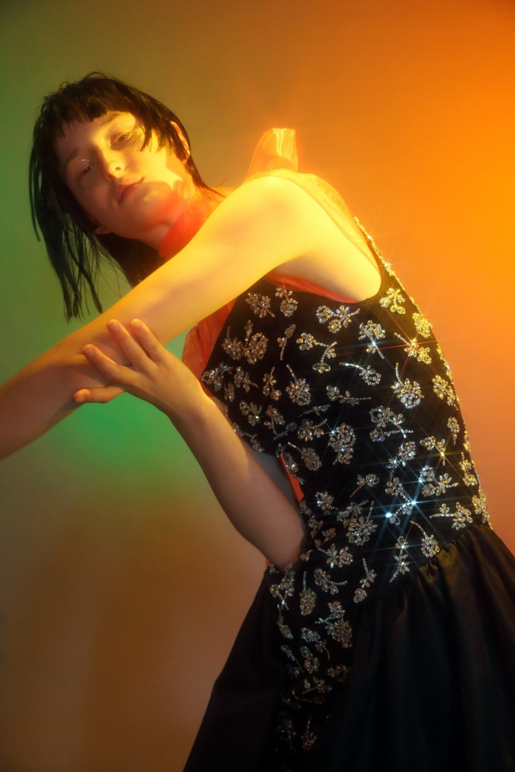 Orange sheer top (HK$7,900) by Prada. Sequin evening dress by Michael Kors (inquiries: 2693 6228).