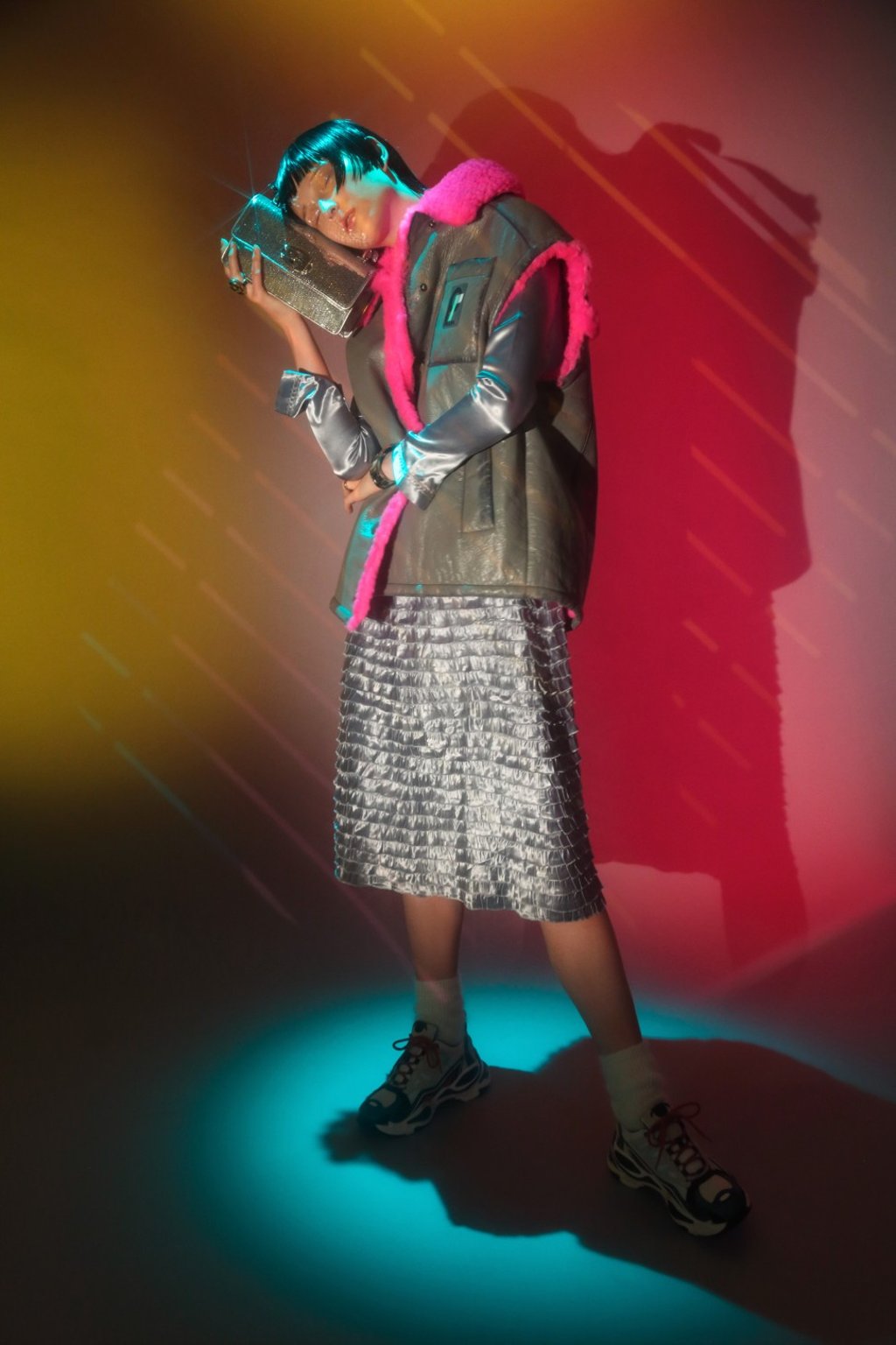 Sleeveless leather jacket (HK$55,950) by Prada. Long-sleeve satin dress (HK$26,000), bracelet (HK$36,000) and rings, all by Bottega Veneta (inquiries: 2973 0882). Bag (HK$14,800) and socks (HK$1,700) by Miu Miu. Trainers (HK$3,490) by Sandro.
