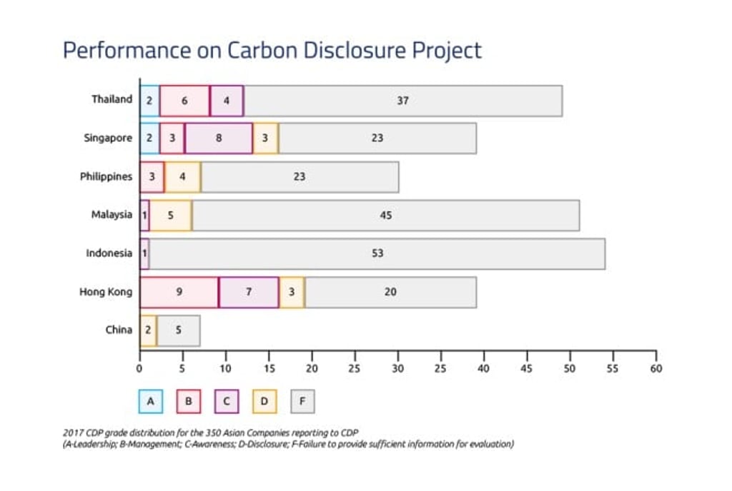 Where there is risk there are also opportunities, starting from mitigation and adaptation to new products and new markets. The bad news is that only a handful of companies in Asia disclose climate risk. Back in 2018, we analyzed a comprehensive and unique set of 350 Asian companies that reported to Carbon Disclosure Project (CDP) in 2017 #3. As expected among the 350 companies, 326 disclosed some information to get a CDP rating. However, 80% of them failed to provide sufficient information for evaluation, hence they received an F rating. Only Hong Kong, Thailand and Singapore have B-level Awareness (the 2nd highest), while none makes it to the A-Leadership position (the 1st -highest rank). Concerning country performance, Singapore ranks the best with only 66% of companies failing to disclose information for evaluation. Indonesia and Malaysia rank the lowest with almost 98% and 80% of companies respectively failing to pass the minimum stage F, which is a failure to disclose.