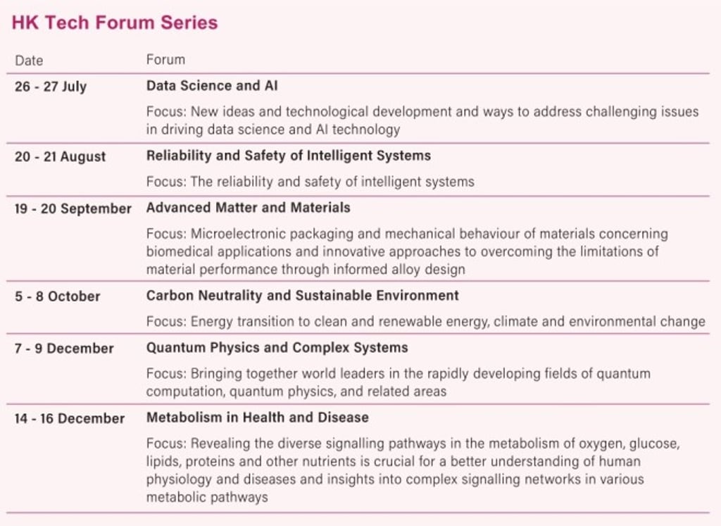 Under the theme “Empowering society for a better future”, the HK Tech Forum series will focus on grand challenges that impact our world, including Data Science and AI, Reliability and Safety of Intelligent Systems, Advanced Matter and Materials, Carbon Neutrality and Sustainable Environment, Quantum Physics and Complex Systems, and Metabolism in Health and Disease, with plans to expand the forum into 2023 and beyond.